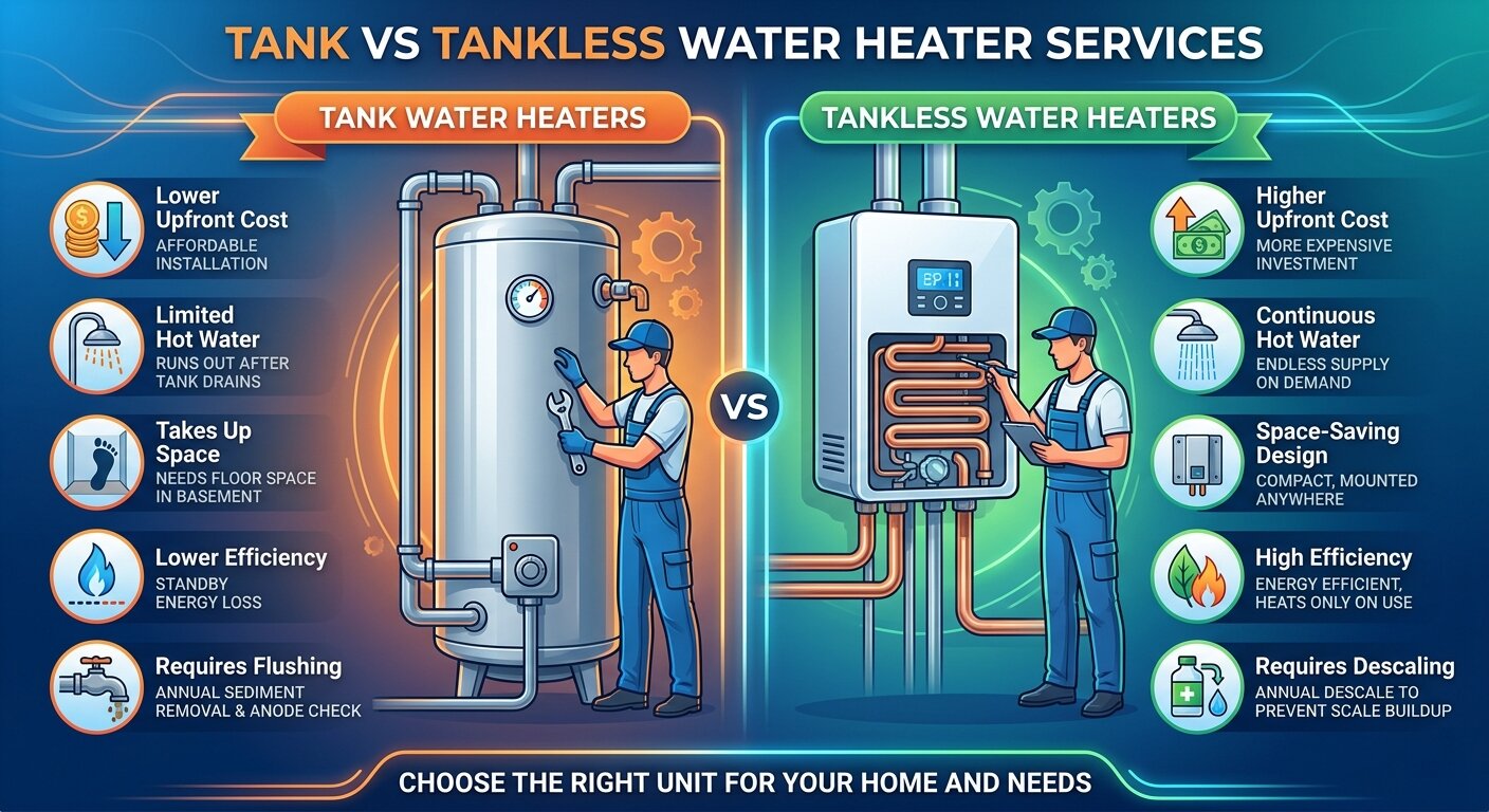 The tank water heater or tankless water heater depends on the household size, usage, and budget. A tank water heater is a container that stores hot water and is relatively cheaper to install. A tankless water heater service in Loma Linda, CA, offers instant hot water, better efficiency, and space-saving. Both systems have professional hot water services in Redlands, CA, which guarantee the systems are installed, maintained, and working correctly to get the most reliable and cost-effective solution.